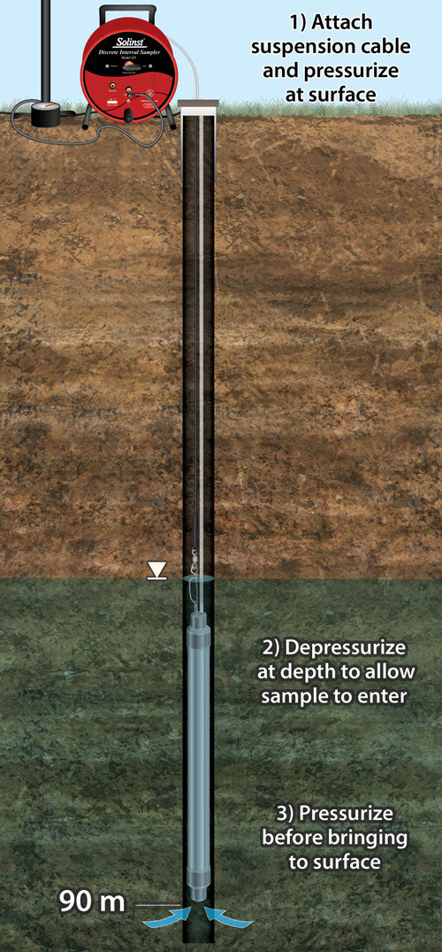 The sampler is pressurized using a high-pressure hand pump before being lowered into the well to prevent water from flowing into the sampler on the way down the well. Once the desired depth is reached, the pressure is released and hydrostatic pressure fills the sampler with water directly from the sampling zone.