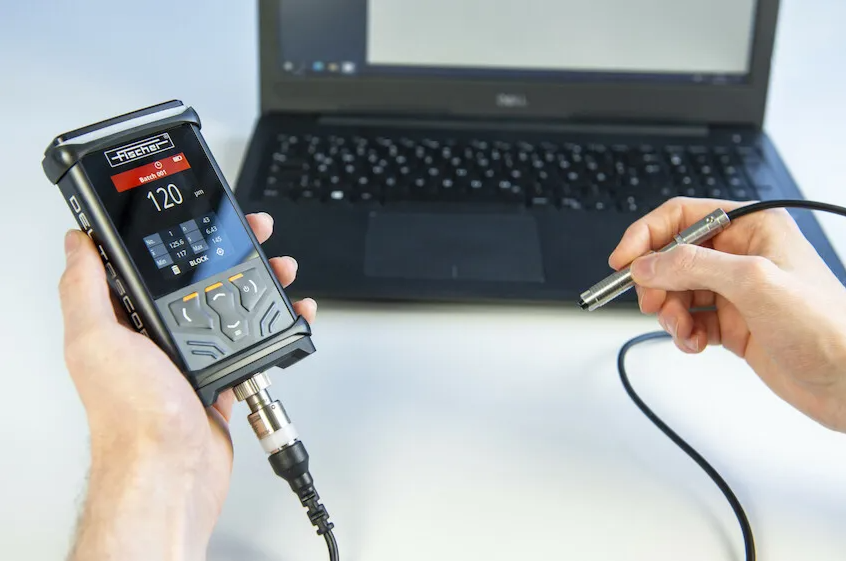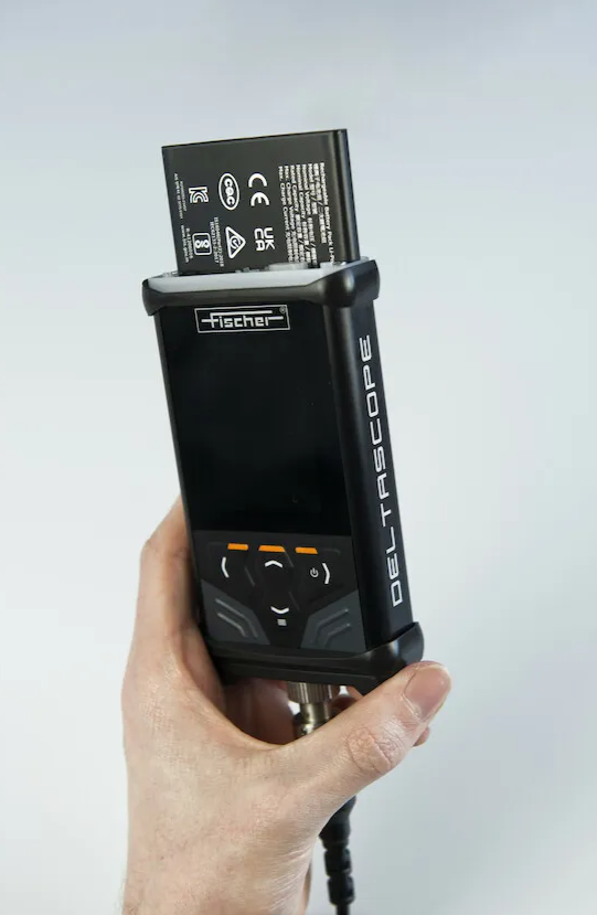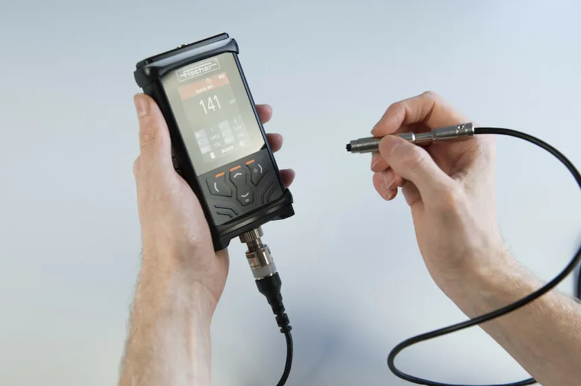 Robust and powerful handheld instrument for coating thickness measurement on ferrous substrates according to the magnetic induction method (DIN EN ISO 2178) with interchangeable  probes.